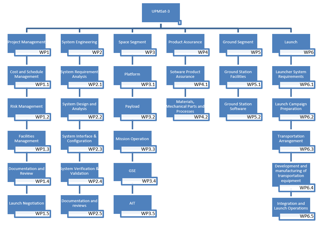 The team responsible for the development of the UPMSat-3 satellite is led by a manager who is accountable to the sponsoring organisations and institutions and a set of work teams (articulated around the work packages defined in the project) coordinated by a system engineer. The work teams, consisting of one, two or three professors and several students, are responsible of the different subsystems with a flexible composition that considers the mobility and availability of staff in a university environment, and the specific needs of the project at the various stages of its implementation.